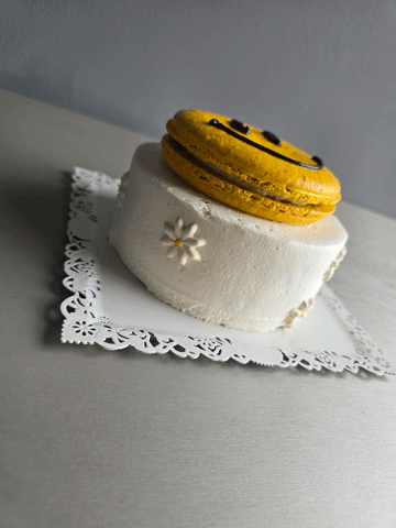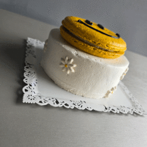 しっとりミルキーなスポンジ生地にたっぷりの生クリームと苺を組み合わせたショートケーキスタイル。トップには大きなマカロンにレモンのクリームをサンド致しました。