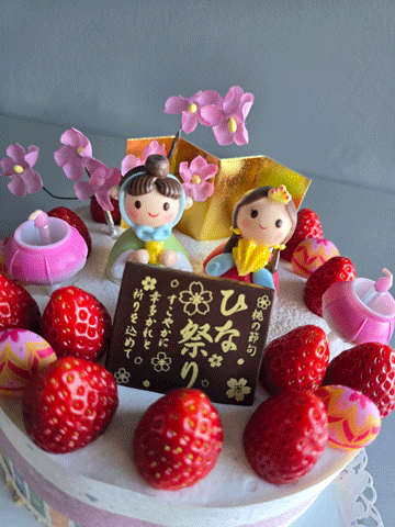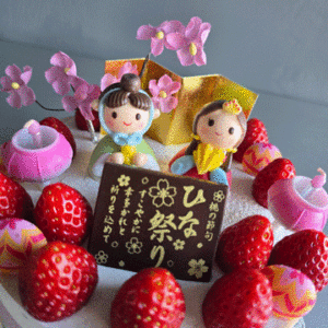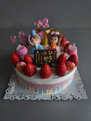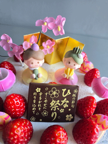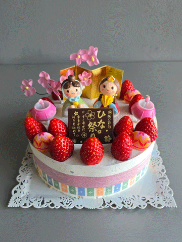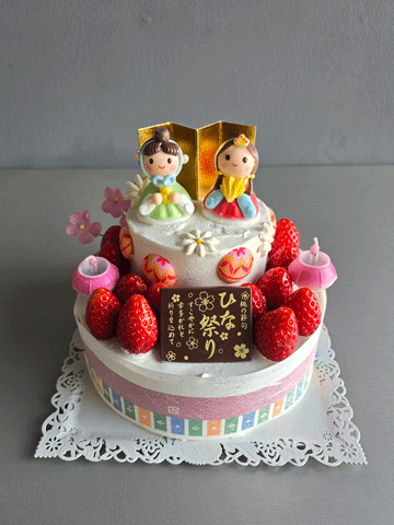 しっとりと焼き上げたスポンジに苺をサンドし,フレッシュホイップクリームで仕上げ致しました。愛らしいメレンゲの雛飾りでお祝い致しましょう。